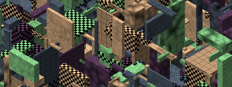 All that’s good but in recent years I’ve been taking a very different approach to doing isometric. Rather than just drawing flat faces, or pre-rendered isometric tiles that someone has hand-drawn - usually at a fixed size - I wanted to draw isometric shapes of varying sizes, with dynamic, high resolution textures, with (somewhat) dynamic shading. I’ve made a few attempts at this, and while it generally works pretty well, I generally got hung up on the API or interface to creating an isometric box, sizing it, positioning it, assigning textures for each of its three faces. For a single box, that’s not too bad, but when you have a bunch of boxes, and you want each one to have a different color and texture… it gets crazy fast. And the last few iterations I did on this were just so frustrating to use that I never used them.